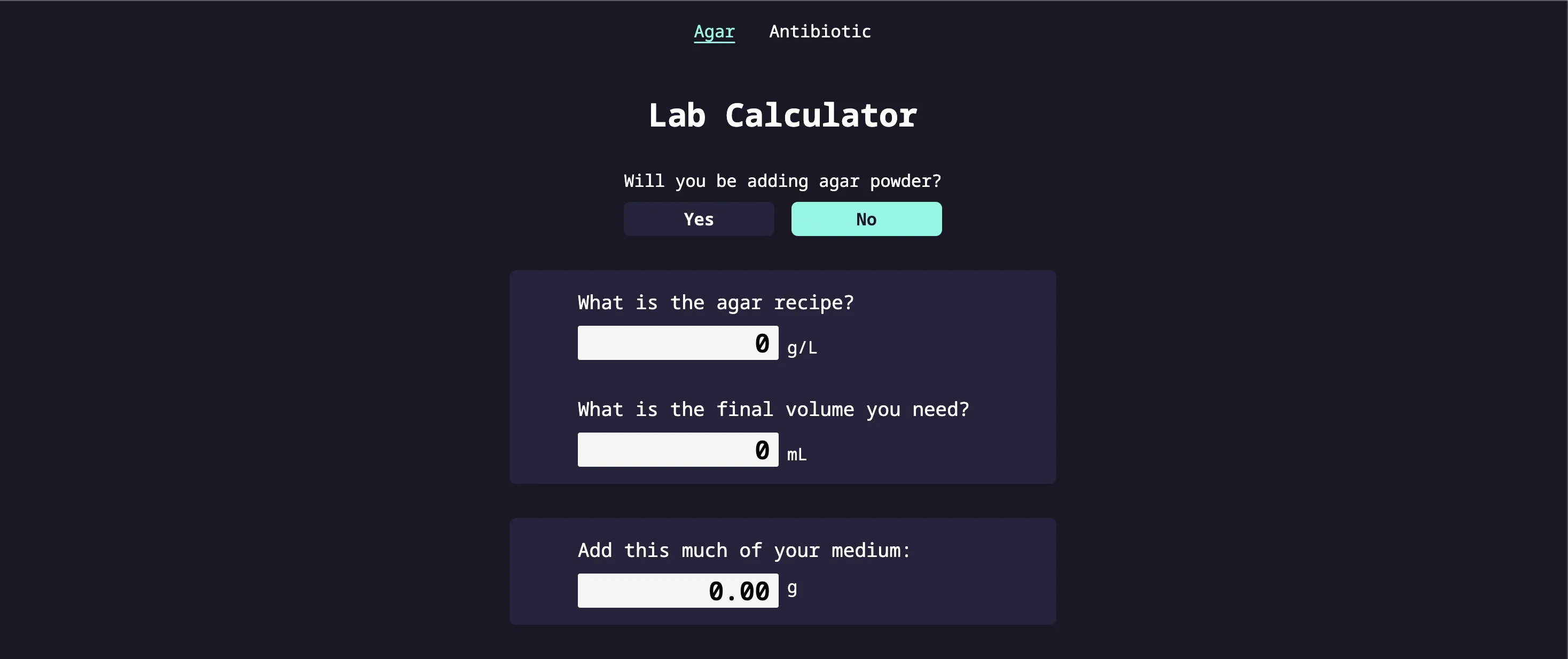 A calculator app for computing common calucations needed in the microbiology lab, such as computing for agar powder amount or computing for amount of antibiotic to put for a stock solution.
